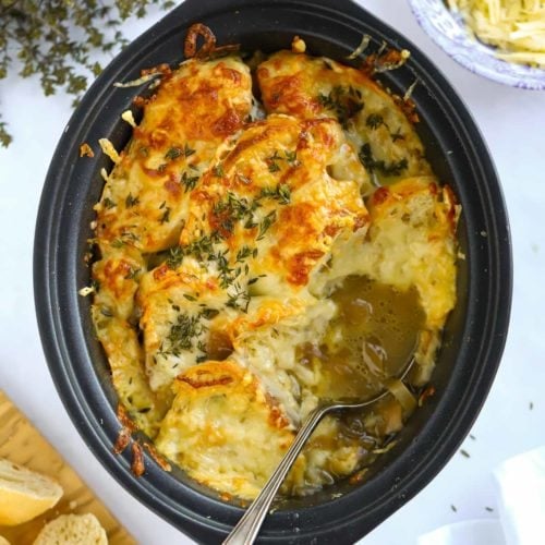 A take on the classic recipe for French Onion Soup but adapted for your Slow Cooker. Complete with giant cheese topped crouton top.